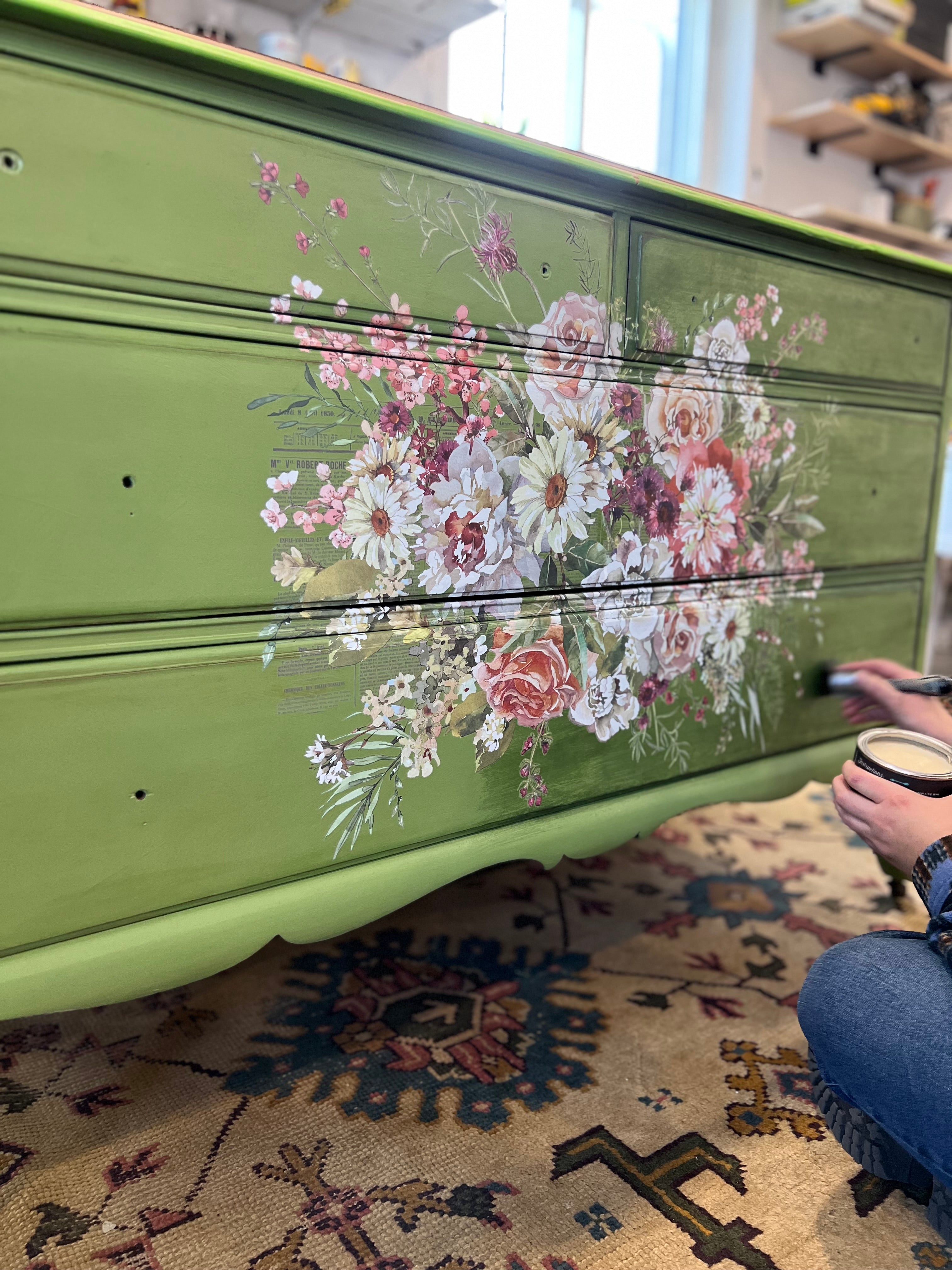 The plan is to complete your furniture piece to bring home and enjoy, and I promise you will learn a wealth of information for your future furniture endeavors! This class covers the basics, but if you’ve taken previous workshops with us and want to do decoupage or a transfer, you can purchase that at the class. That said, these techniques will not be taught at this workshop.